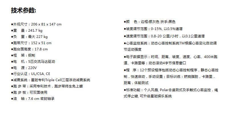 ●5匹交流马达驱动,提供稳定、顺畅的动力 ●采用星驰专利Triple Cell三层浮动减震系统 ●动态心率控制系统TM:根据用户的心率自动调节运动强度 ●跑步带终生免上蜡 ●受广大用户喜爱的可调节式风扇 ●400米跑道设计,使运动更具趣味性 ●友好的用户界面和控制面板,动态滚动4字节的信息窗口显示。 12个预设程序,Polar ®遥测式和手触式心率监测系统及多用途个人物品存放架 ●便捷启动功能,两个紧急停止按钮 ●内置预留线,可升级星驰娱乐系统 ●宝马汽车设计师美国DesignWorks倾力外观设计