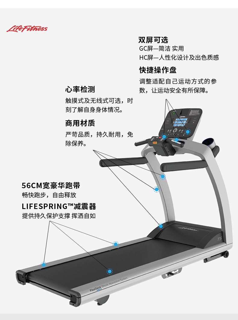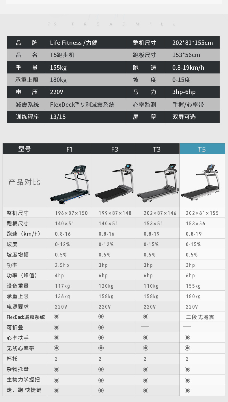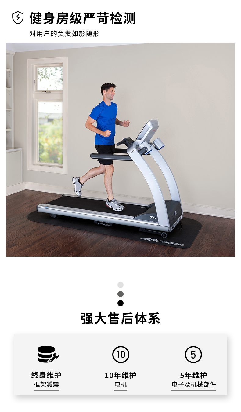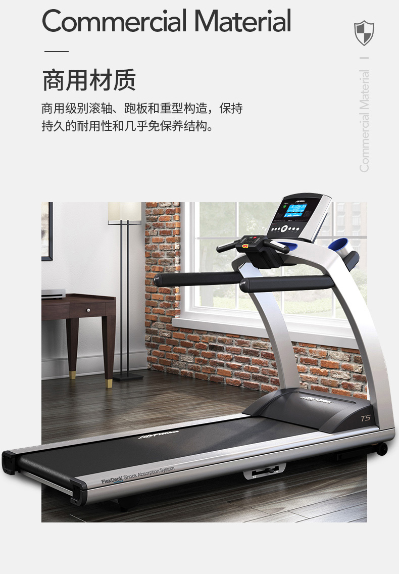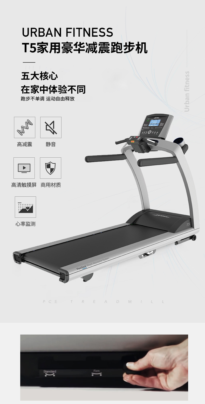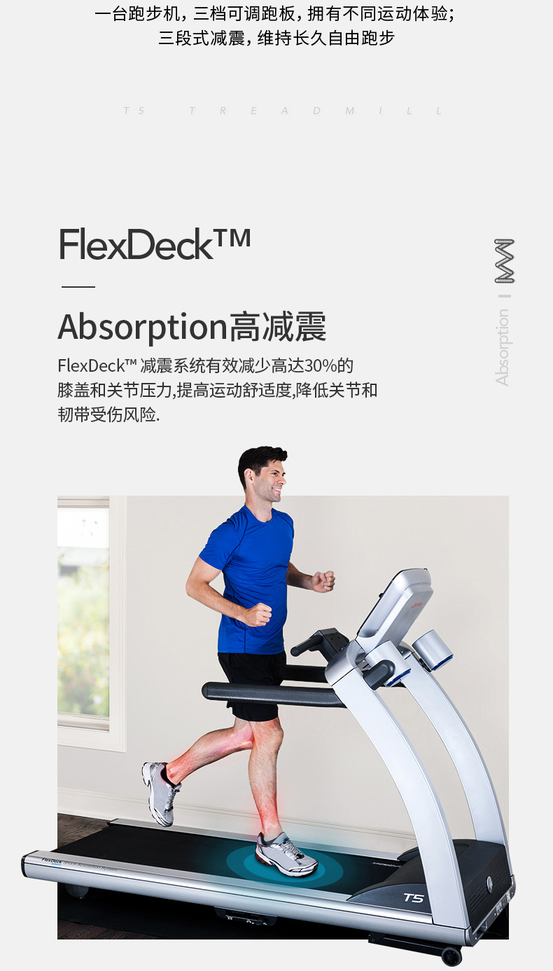 利用 T5 跑步机,您可以在三个不同的跑合面硬度设置下训练,这归功于 FlexDeck Select 系统。直观的跑步机界面让您可以记录首选的步数、慢跑和跑步速度,还让您可以选择很多其他程序 - 都通过触摸一个按钮完成。