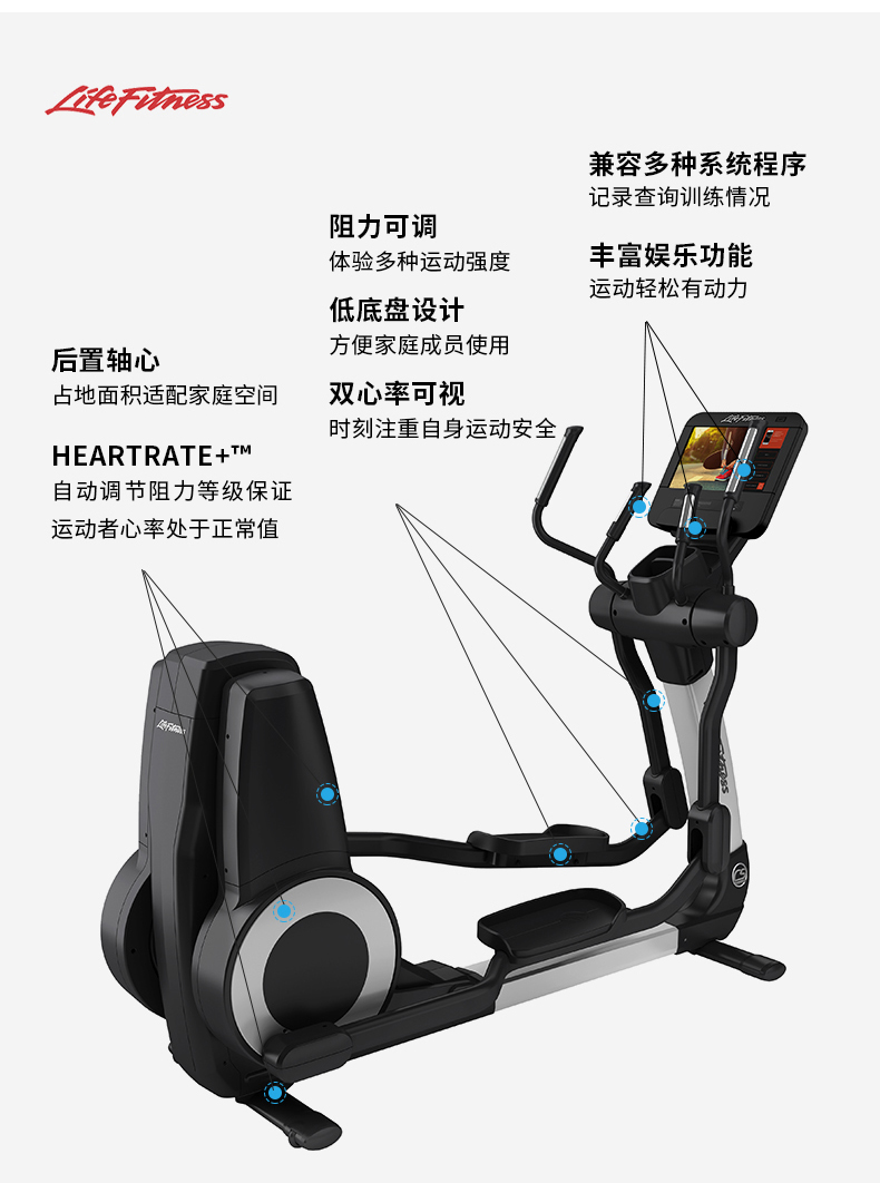 Platinum Club 白金俱乐部系列椭圆全功能训练器为家庭带来了俱乐部品质的耐用锻炼设备。大量娱乐和参与选项提供了增强的互动和积极性,而天性自然的运动提供了舒适的低强度全身运动。